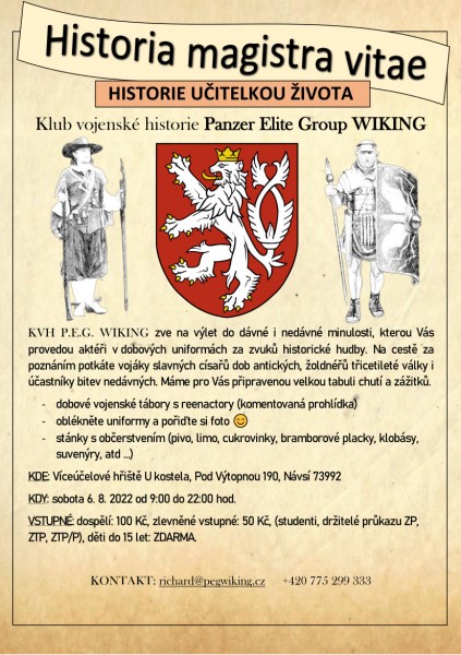 KVH P.E.G. WIKING Vás zve na výlet, již podruhé do minulosti, kterou Vás provedou aktéři v dobových uniformách za zvuků historické hudby. Na cestě za poznáním potkáte vojáky slavných císařů dob antických, žoldnéřů třicetileté války i účastníky bitev nedávných. Máme pro Vás připravenou velkou tabuli chutí a zážitků.